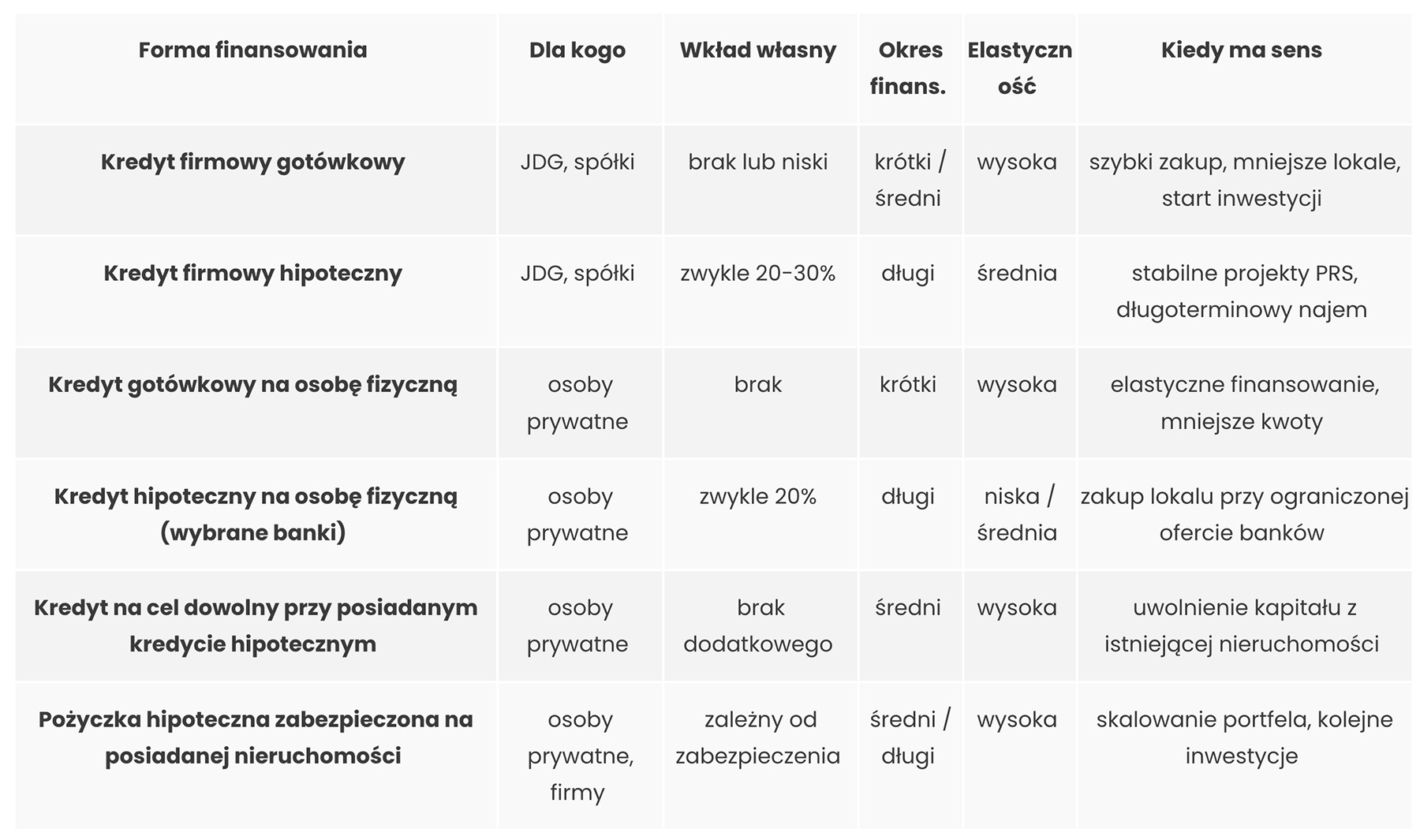 Finansowanie lokalu inwestycyjnego nie sprowadza się do jednego, uniwersalnego produktu bankowego. Inwestor ma do dyspozycji kilka różnych narzędzi, których wybór zależy od formy działania, skali projektu oraz planowanej strategii podatkowej i inwestycyjnej.