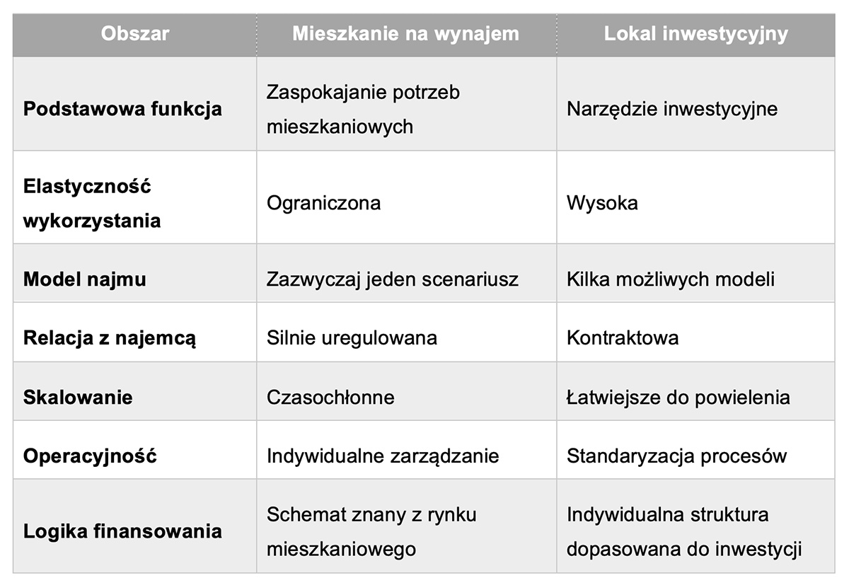 To nie kwestia „lepszego” lub „gorszego” rozwiązania, ale wyboru modelu działania. Mieszkanie sprzyja inwestycjom jednostkowym i bardziej pasywnym, natomiast lokal inwestycyjny naturalnie wpisuje się w podejście biznesowe.